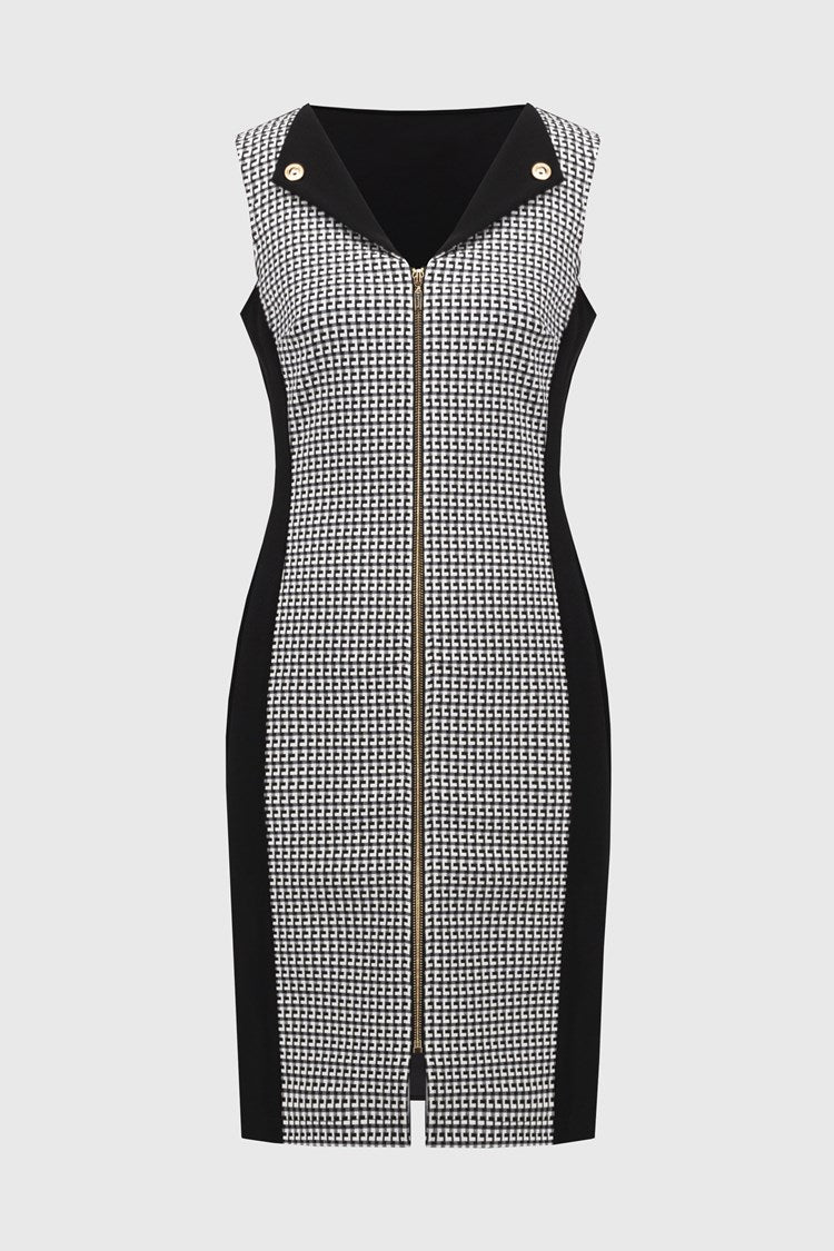 Dare to stand out from the crowd in this modern take on the classic sleeveless sheath dress. Woven jacquard in a geometric print combined with black silky knit panels creates a slimming effect, while the zippered front adds an enticing appeal. A V-shape neckline opens up to contrasting lapels that display stylish button details.