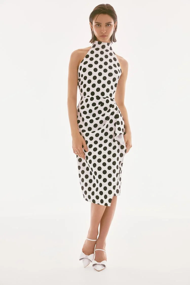 A halter mock neckline, sheath silhouette, and a cascading pleated drape detail come together to create a vivacious look fit for a special soirée. Crafted from a luxurious twill fabric with an alluring dotted print, this dress is sure to mesmerise the crowd. Part of the Signature collection.