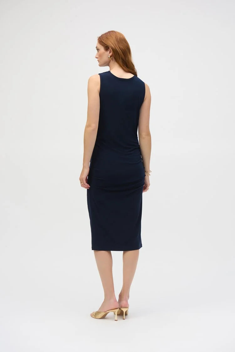 Redefine elegance with this sleek sleeveless dress, expertly crafted from soft, silky knit fabric. Its sophisticated draped neckline, accentuated by an elegant ornament, adds a touch of glamour. The flattering sheath silhouette is enhanced by delicate side pleating, creating a feminine allure. Versatile and refined, this dress effortlessly transitions from day to evening, making it a true wardrobe essential.