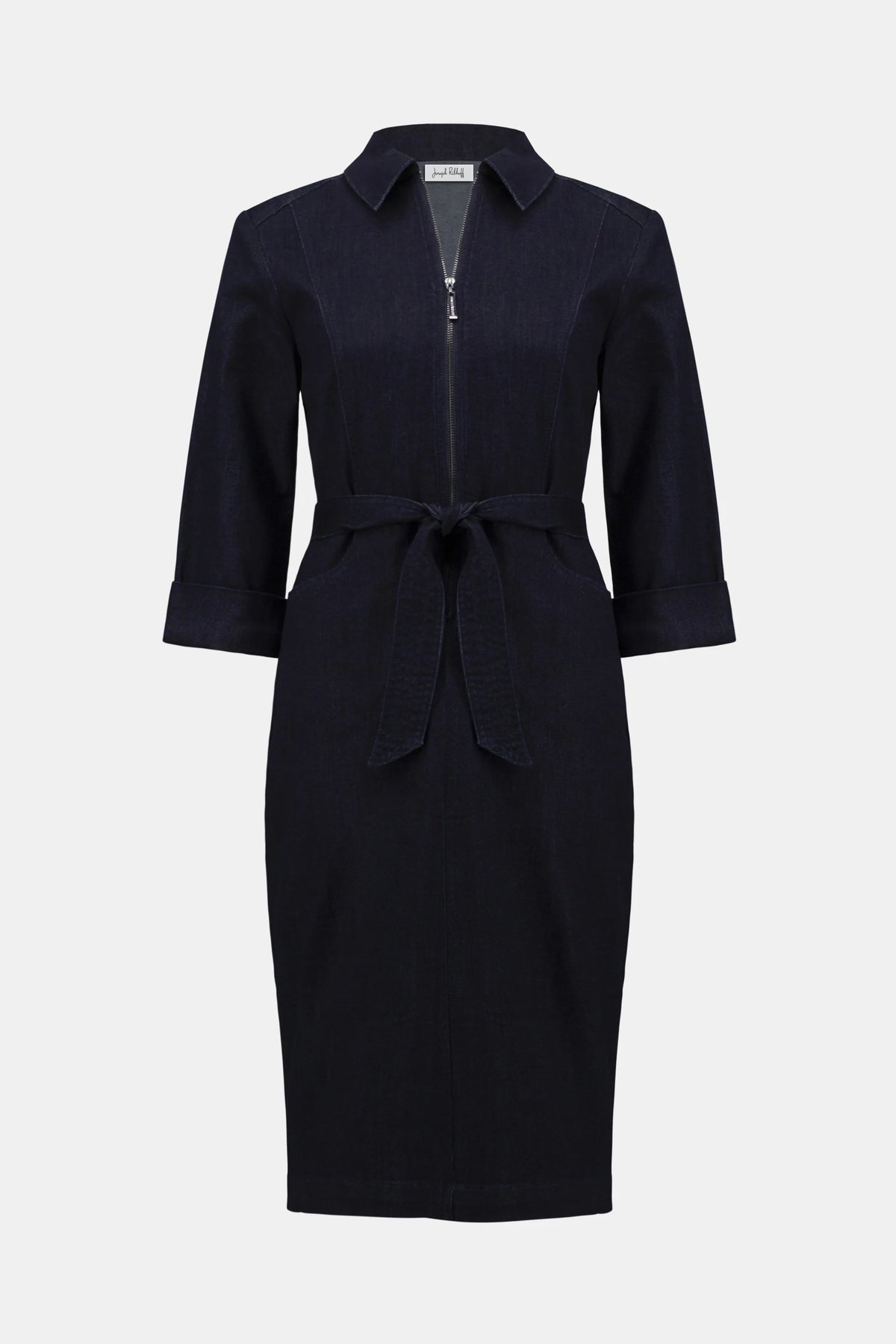 Effortlessly cool and casually polished, this Joseph Ribkoff Featherweave™ denim dress features a half zip neckline, flattering self belt, and three quarter sleeves for easy, pulled-together style.