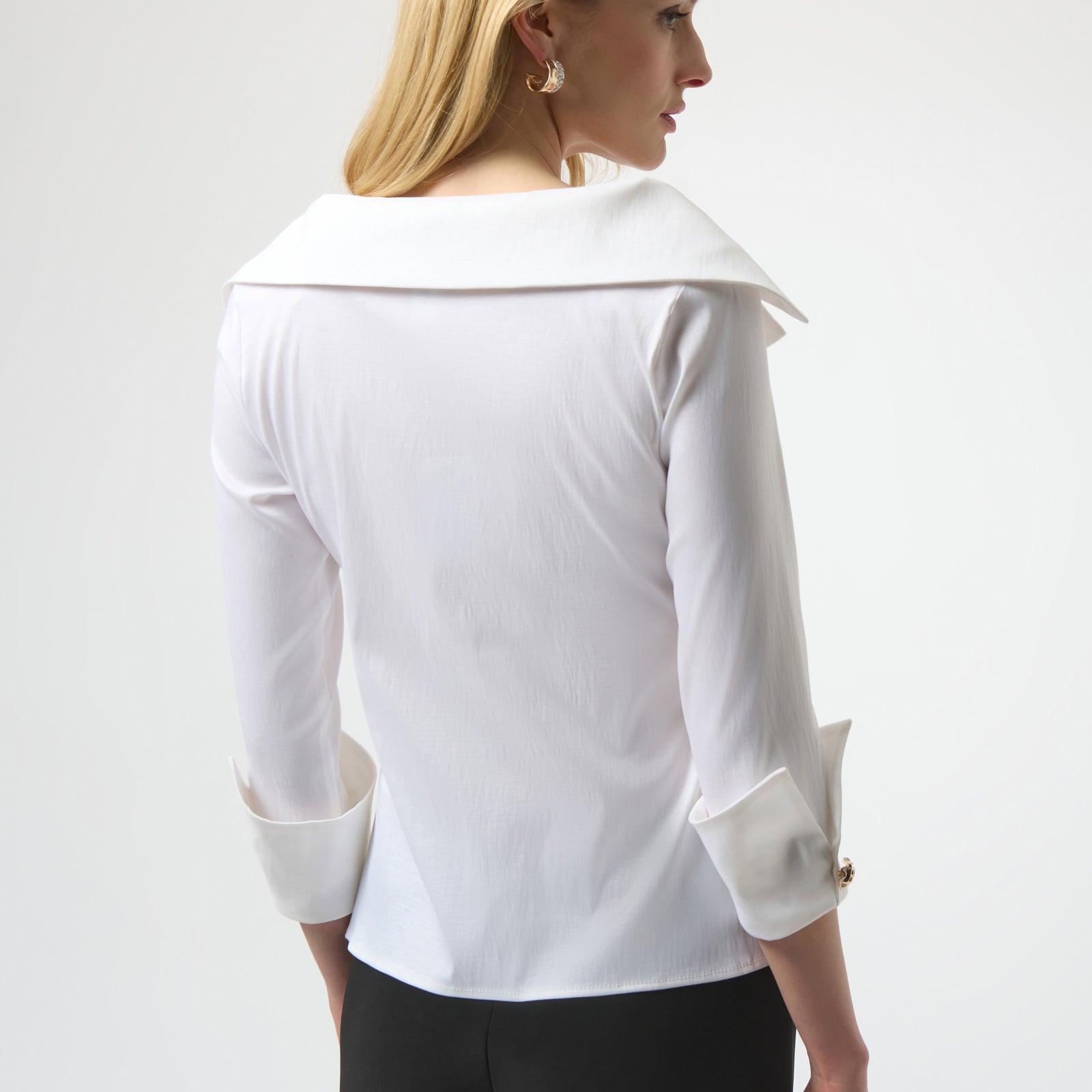 This stretch taffeta top presents an exquisite fitted silhouette boasting a dramatic over-the-shoulder notched collar. Delicate rose button accents grace the folded cuffs of its three-quarter sleeves, while an invisible side zipper ensures a seamless finish.