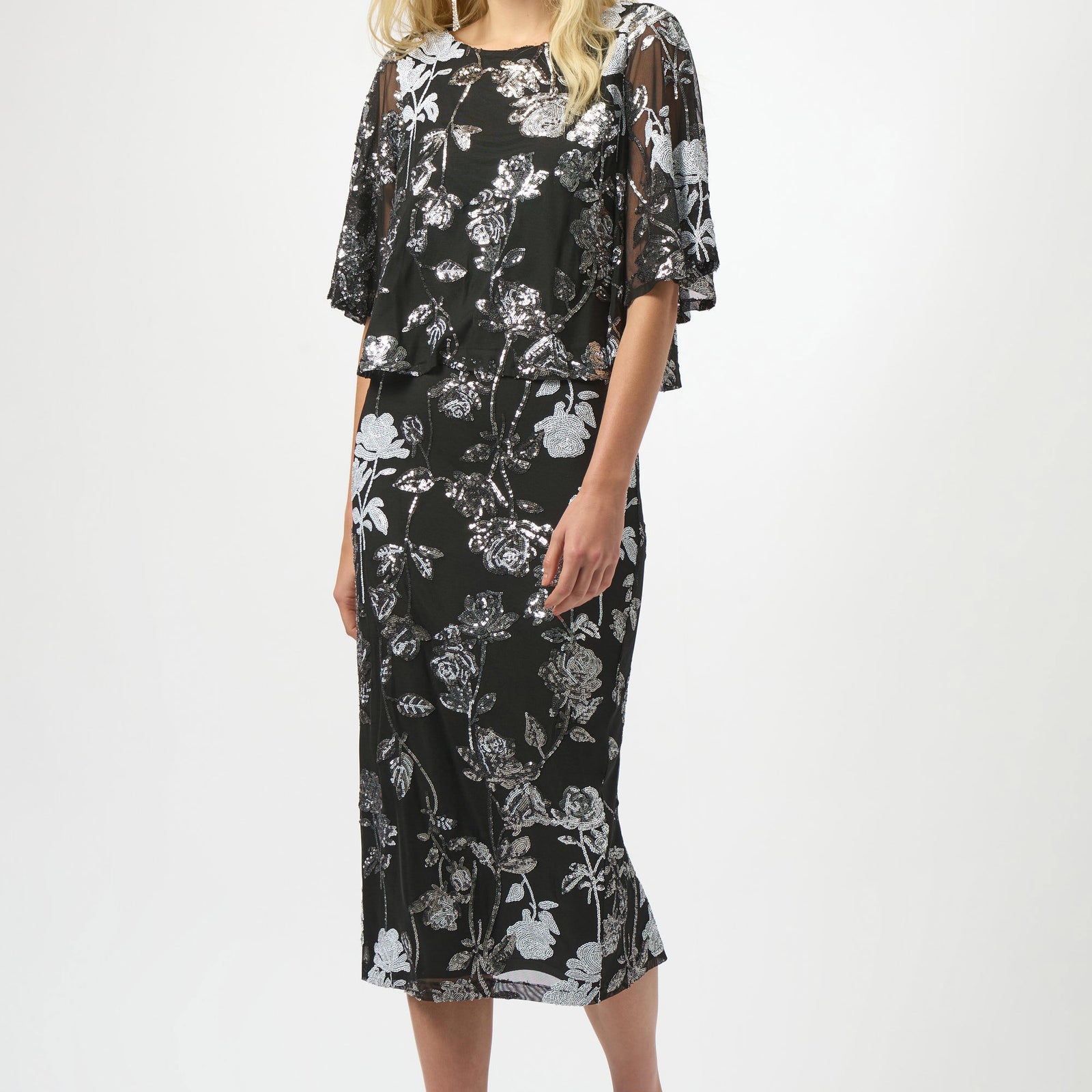 An embroidered sequined floral design gives this pencil skirt an undeniable wow factor. Featuring a sleek satin elastic waistband and a flattering below-the-knee length, it effortlessly blends comfort with standout style.
