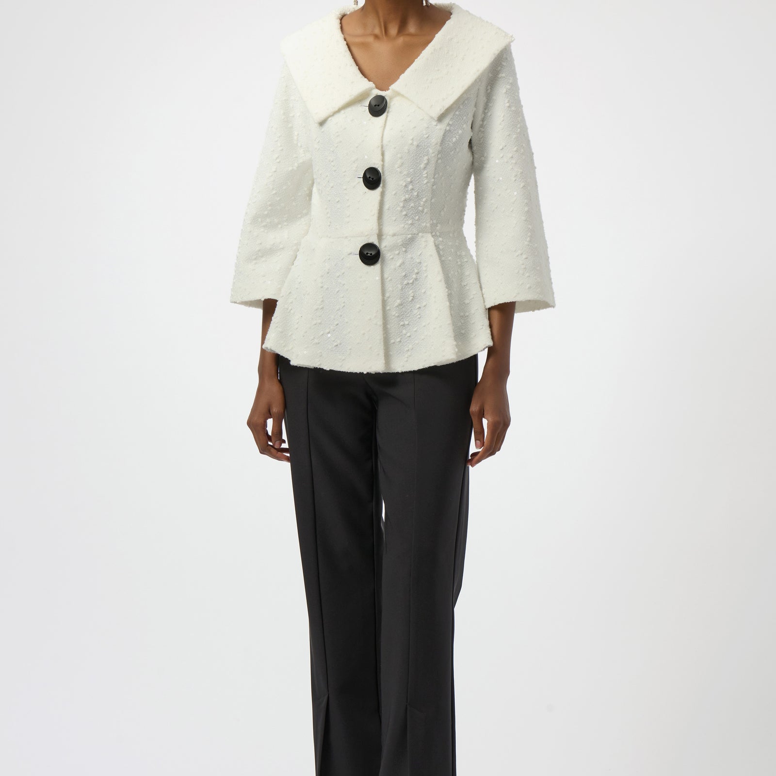 This peplum jacket exudes refined elegance with its feminine bell sleeves, statement lapel collar, and sleek front button closure. Crafted from sequined bouclé fabric for a hint of shimmer, it blends timeless sophistication with a touch of modern flair.