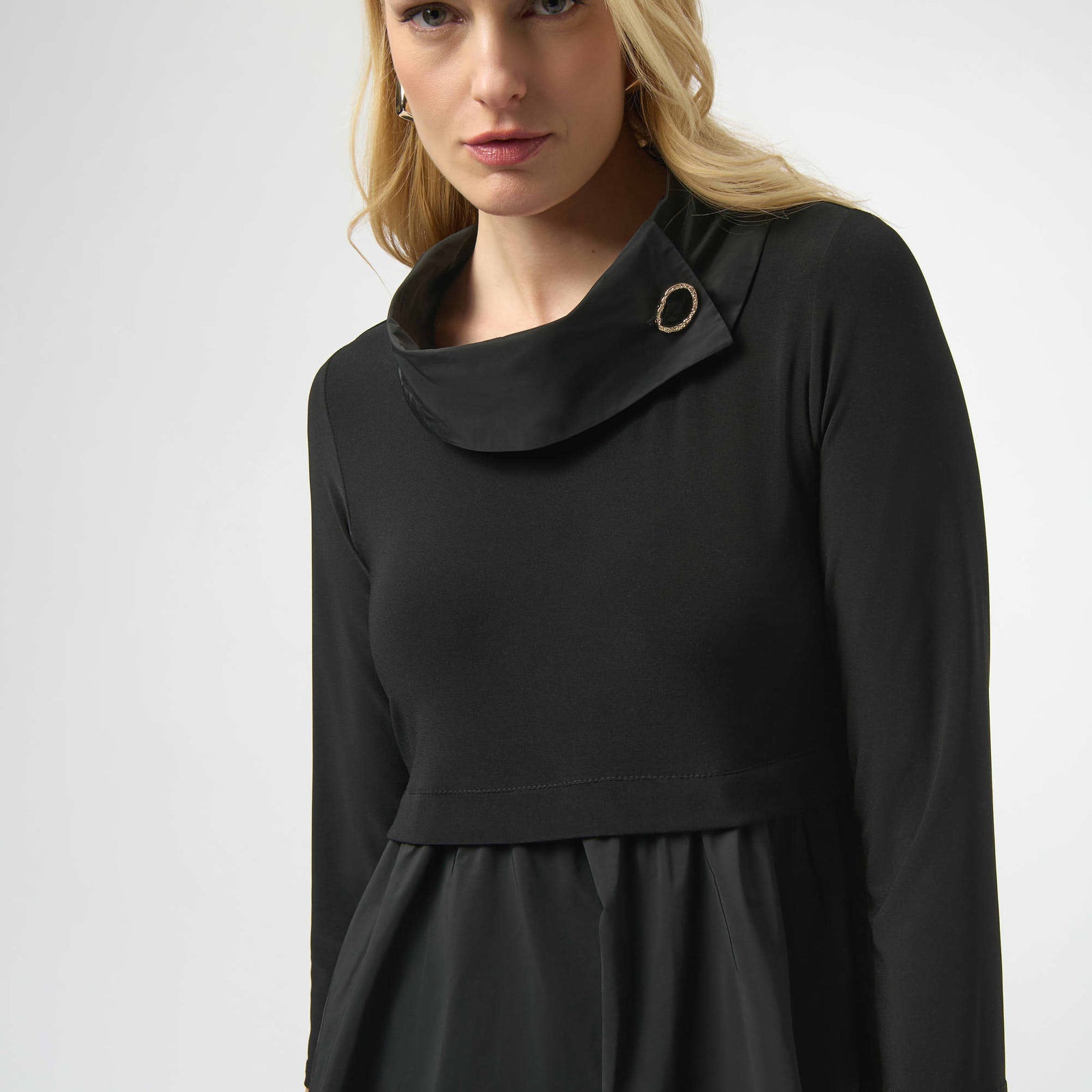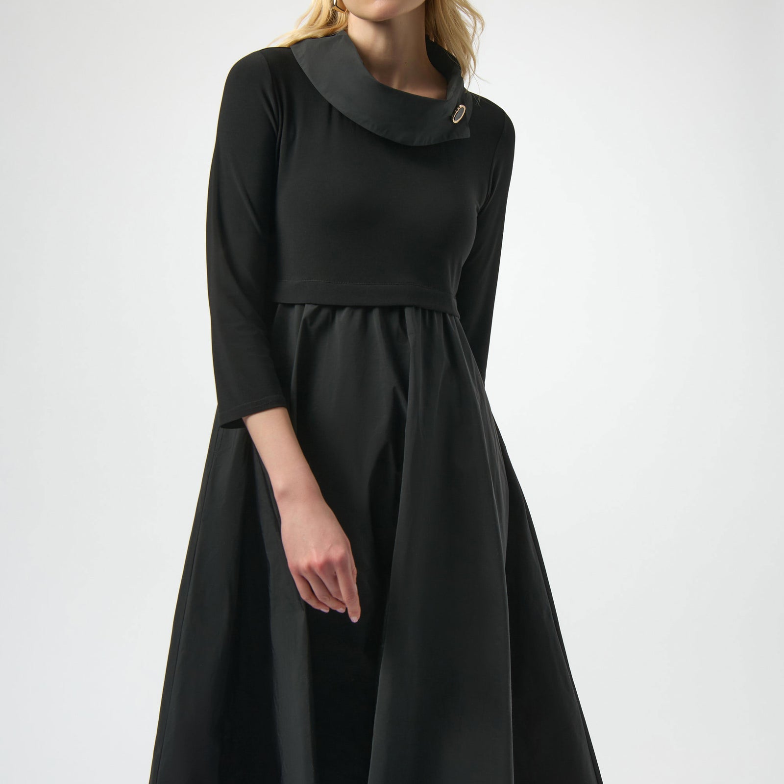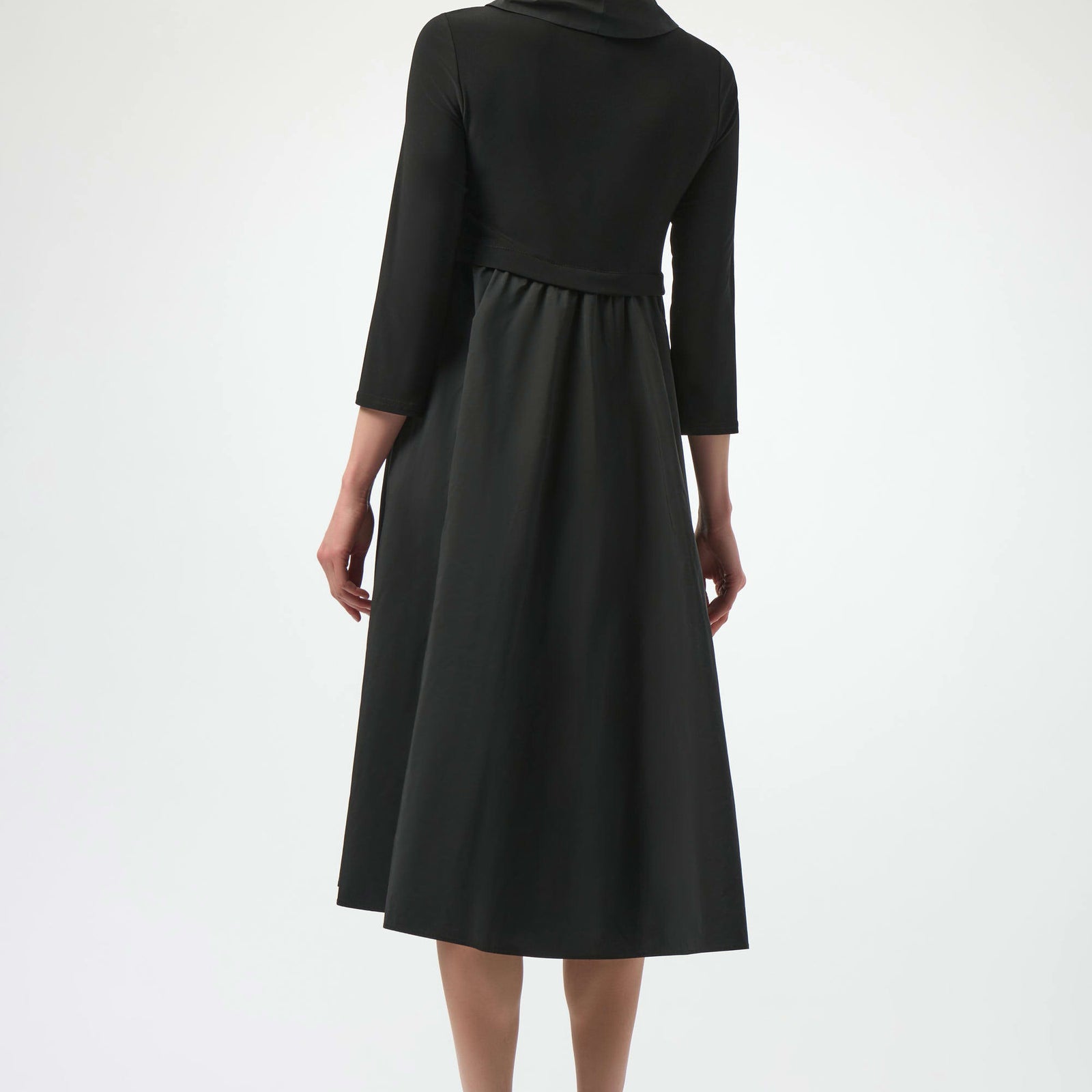 Impeccably crafted, this fit and flare dress features a silky knit bodice paired with a beautifully gathered memory fabric skirt for a sophisticated look. The unique overlap collar, accented with a decorative button, adds a touch of elegance, while the mid-calf length ensures versatility for any occasion.