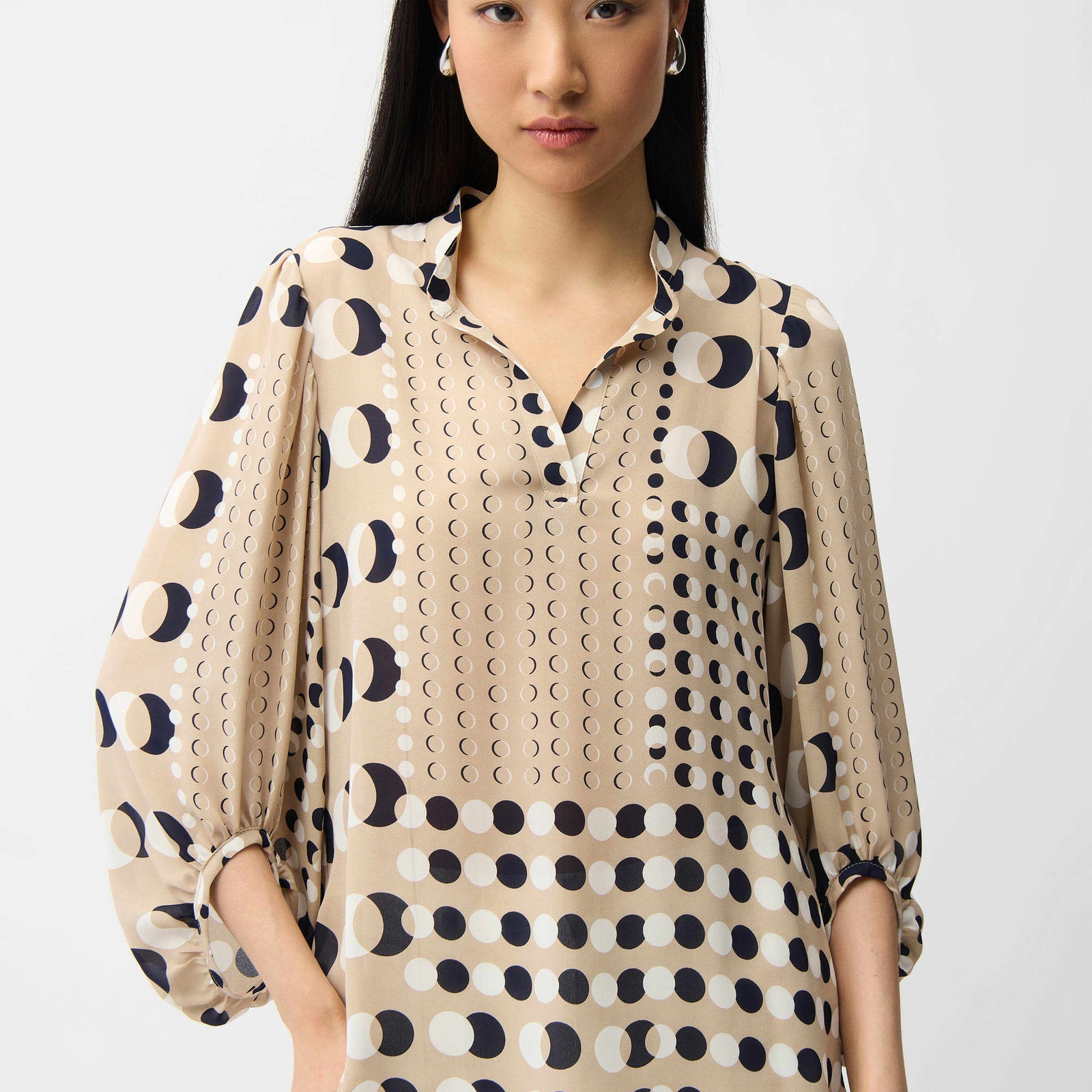 Light and breezy with a playful twist, this recycled georgette tunic features a dotted print, a refined stand collar with a front slit, and three-quarter puff sleeves for an effortless silhouette.