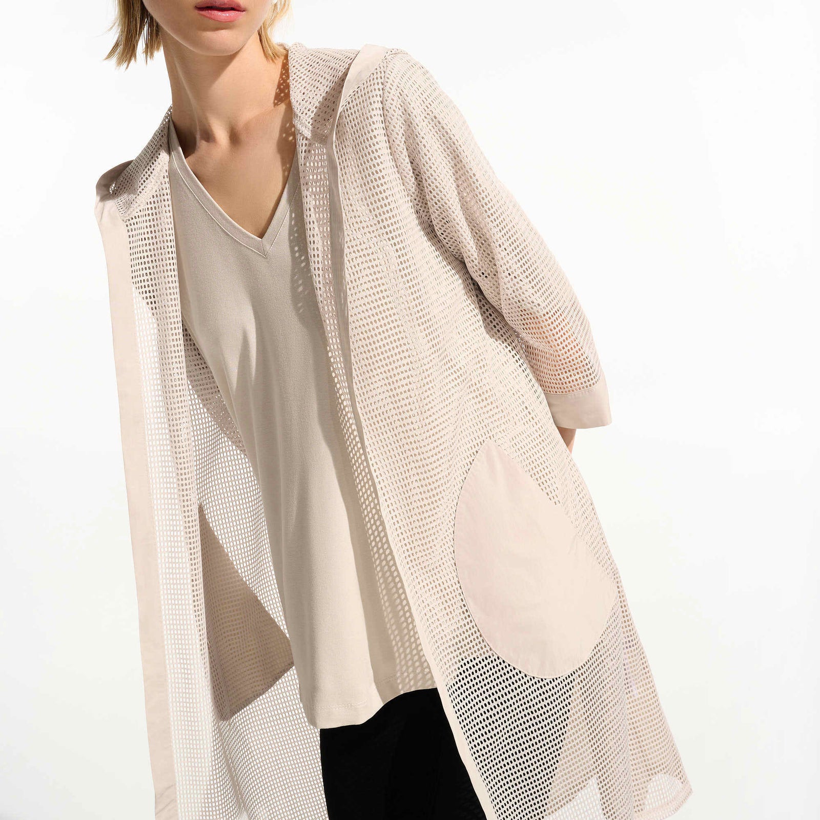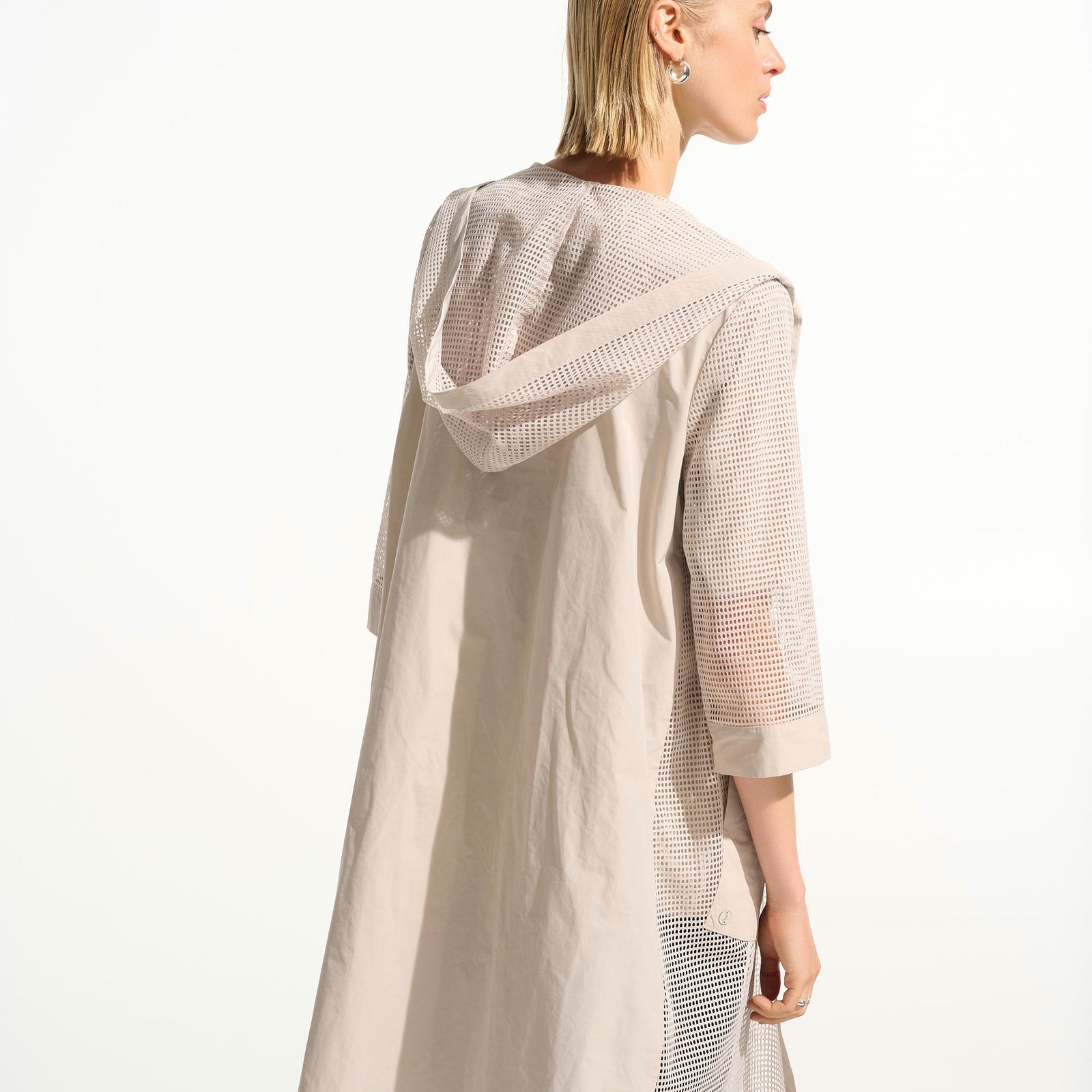A casual cover-up with clever contrasts: smooth memory fabric meets airy mesh in this easy A-line silhouette. Finished with a hood, cuffed three-quarter sleeves for a relaxed, functional feel.