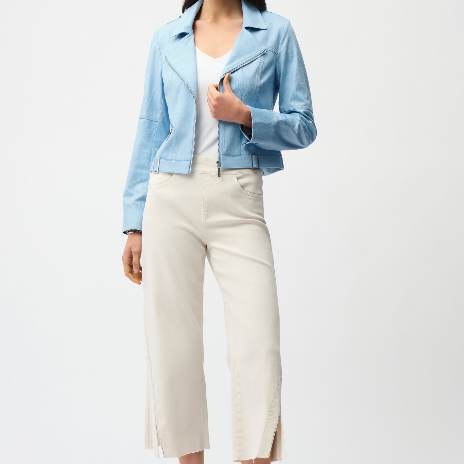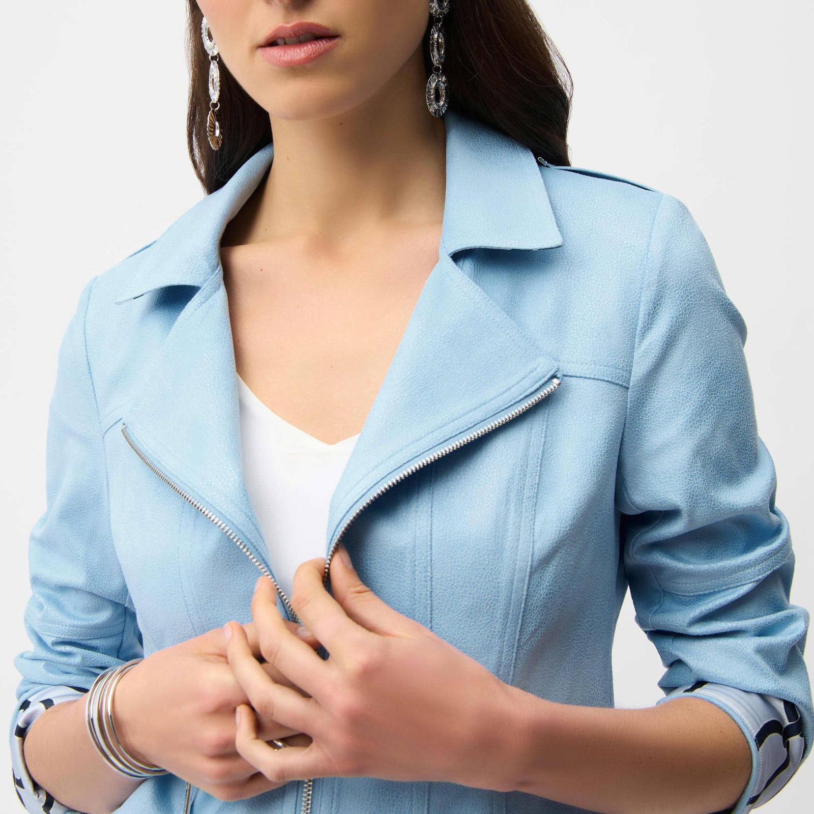 • Zip-front closure with faux pocket zippers