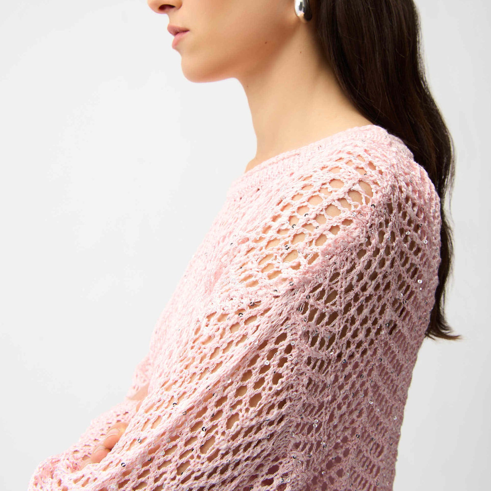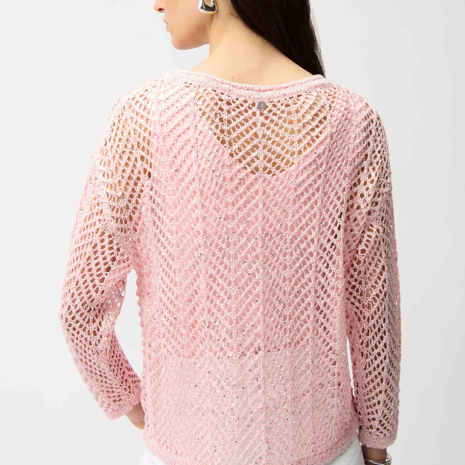 This sequins yarn sweater features a solid chevron open stitch design, offering a relaxed fit with a crew neck and long sleeves. The perfect blend of comfort and sparkle, it’s a stylish piece for day-to-night wear.