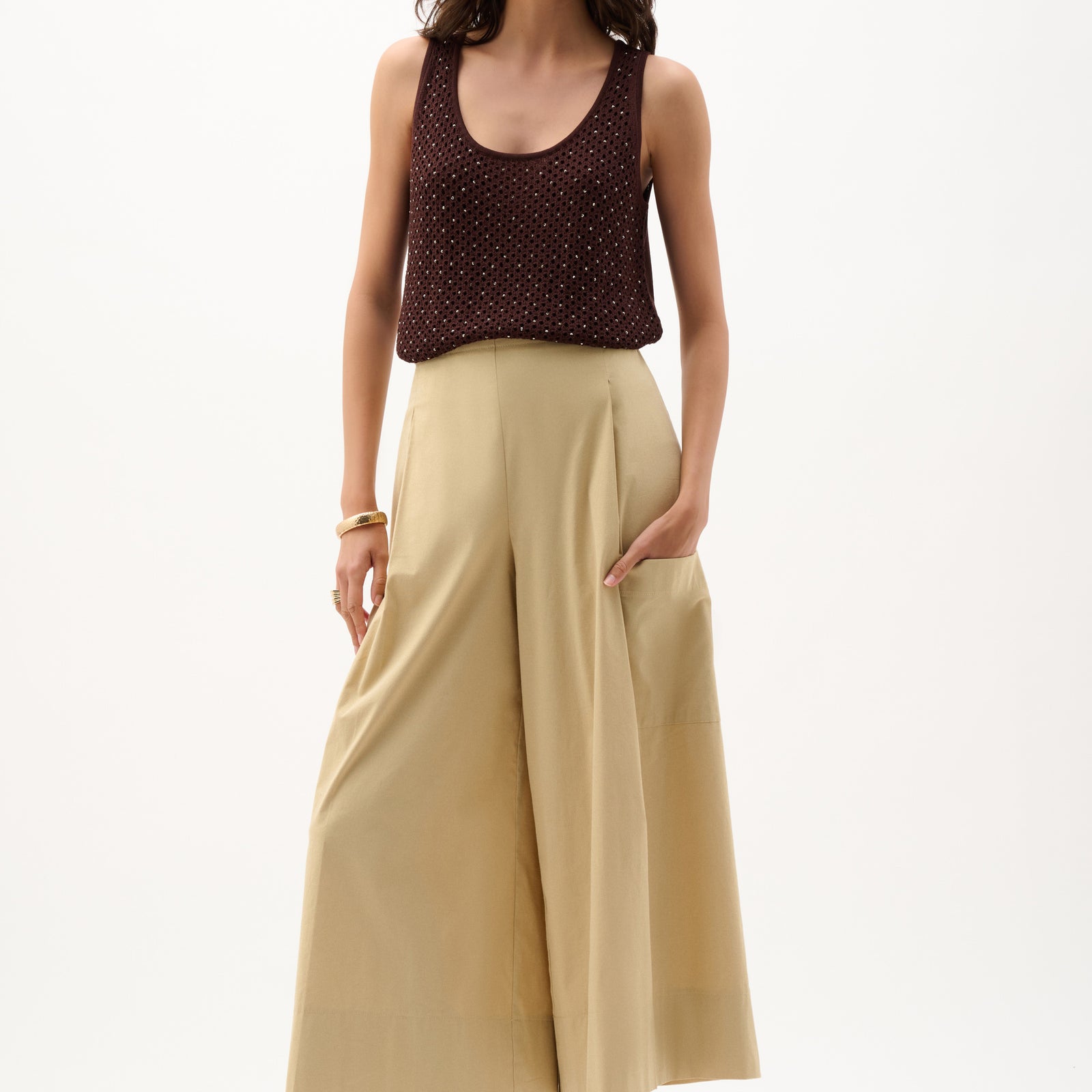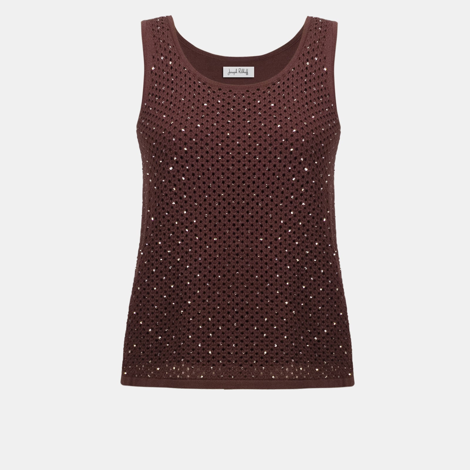 A straight-fit knit viscose-nylon camisole with an open-stitch design. Fully lined and adorned with allover iron-on stones on the front and a JR metal coin detail for subtle sparkle.