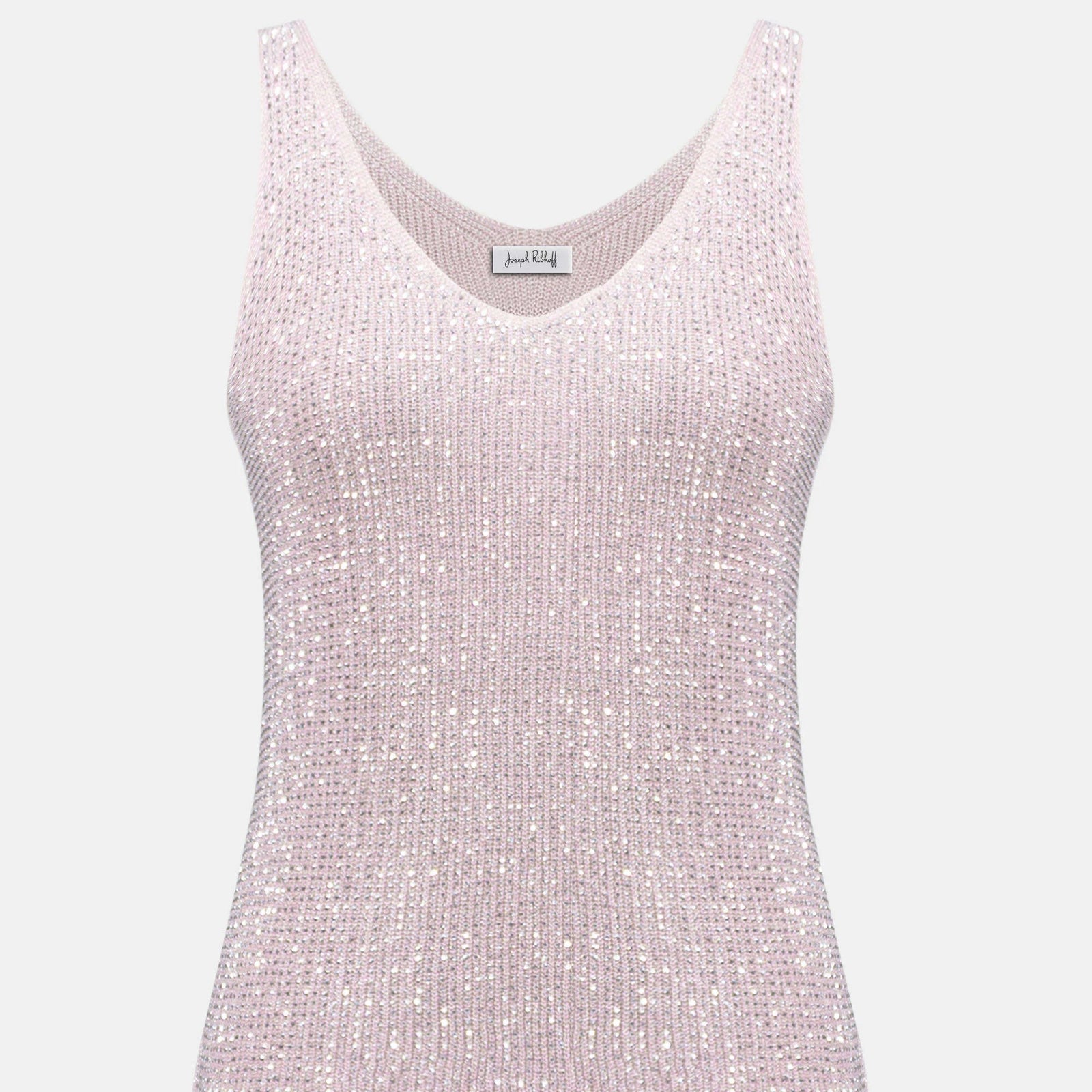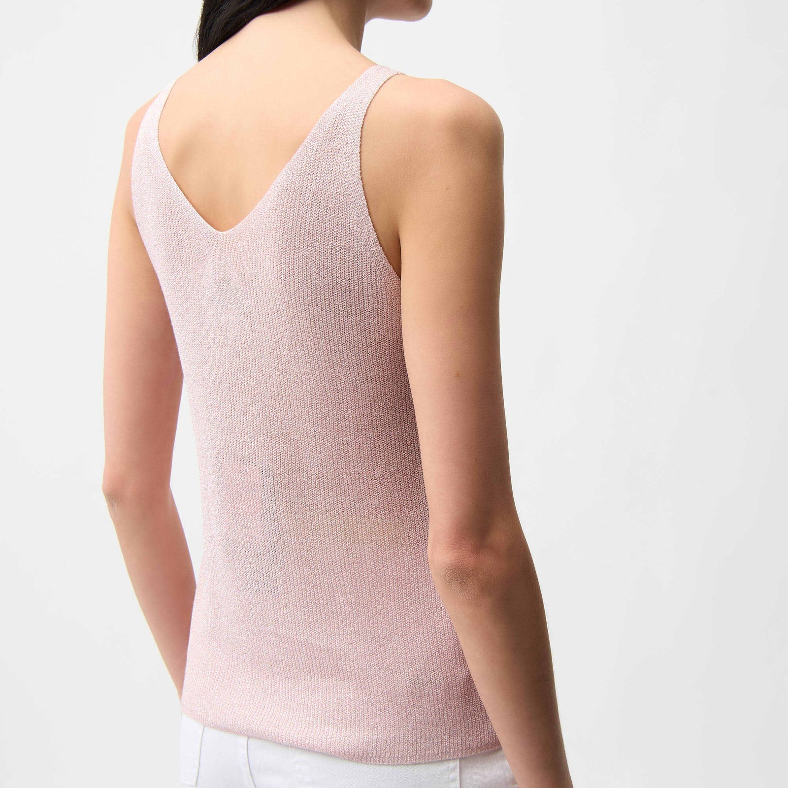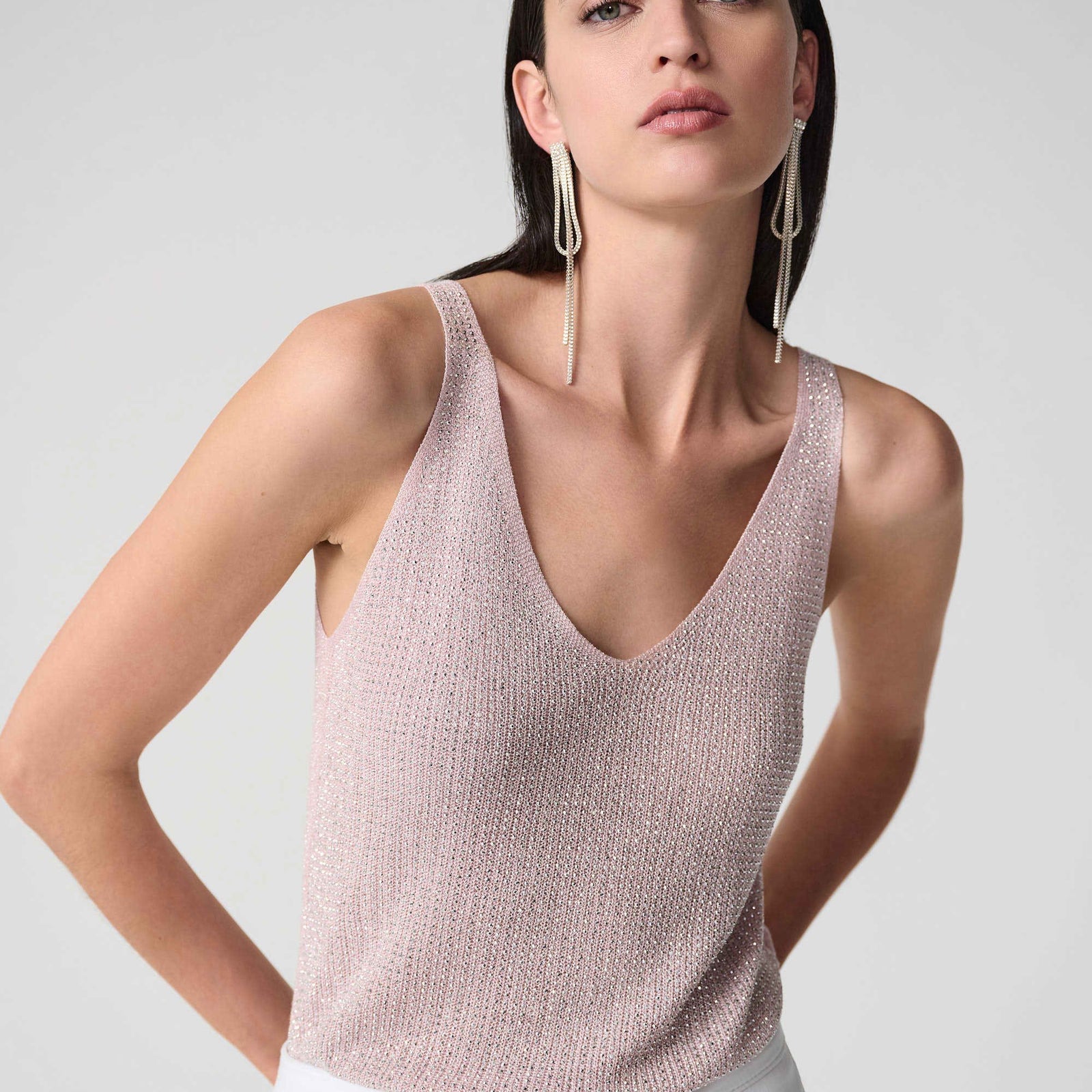 Get ready to dazzle at your next event in this sleeveless camisole. Crafted from a ribbed sweater knit blended with shimmering metallic fibers, it’s designed to catch the light and all the attention. The flattering V-neckline in both the front and back, paired with iron-on detailing, makes this top perfect for any party or night out.