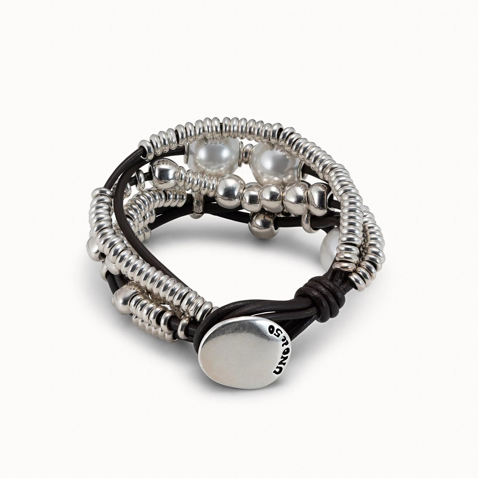 Uno de 50 Leather beaed bracelet with pearls Style # PUL0578MTL