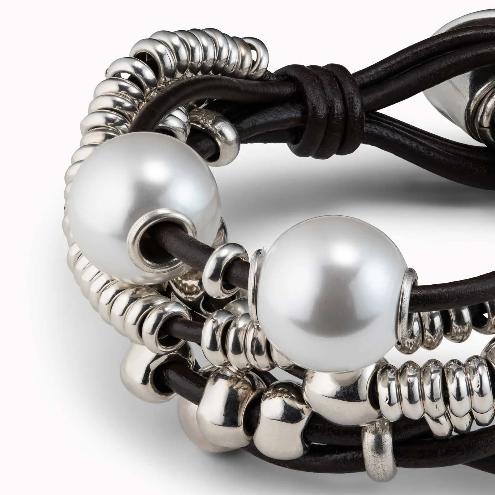 Bracelet with a design of rows of leather combined with pieces of sterling silver-plated metal and synthetic white pearls. This piece has been handcrafted in Spain.
