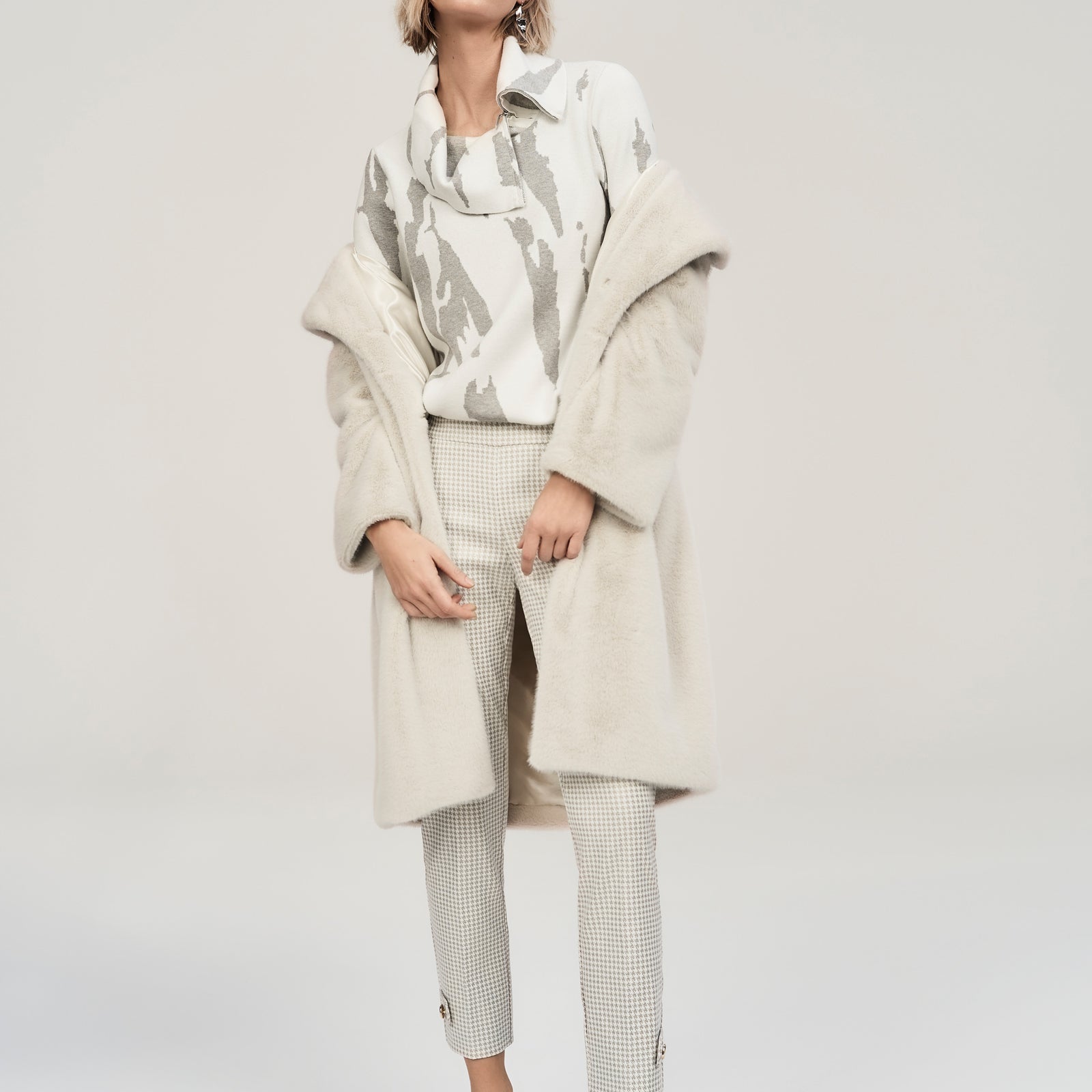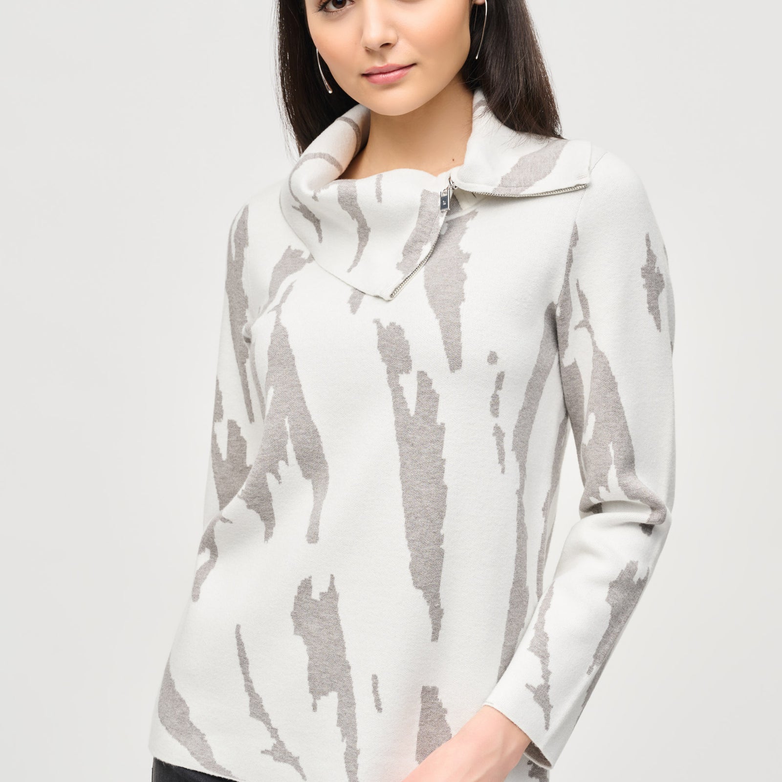 Casual elegance meets sophisticated comfort in this brushed jacquard knit sweater with a zipped cowl neck. Wear it out or wear it in, look fabulous whatever you decide.