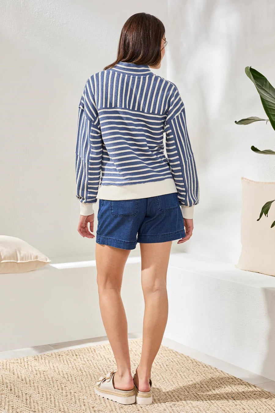 French terry knit Puff sleeve design Oversized eyelet detail Relaxed modern silhouette Soft cozy hand Spring layering piece